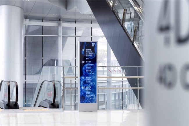 在导视系统的设计方面,乐诚创意以极简的视觉语言精准呼应场馆的空间气质,使形式依附于导引功能,以低调姿态融入环境,在克制与理性中构建出清晰的秩序感。为与整体空间环境相融合,导视采用不锈钢银色烤漆,结合简约现代的线条语言,以及以品牌超级视觉符号为原型的精神堡垒,巧妙地将“微观世界”这一探索主题悄然植入标识中,同时通过动态的微观图景融入电子导视标牌,使原本功能性的指引界面,转化为充满生命力的科学窗口。