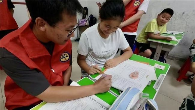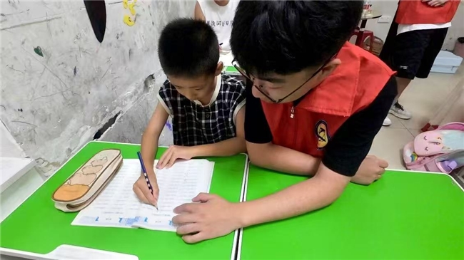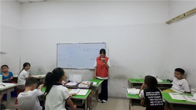 在教室里,志愿团化身“解题摆渡人”。他们拿着数学练习册,把复杂的数学题简单化,当孩子算出正确答案时,眼里闪着成就感的光;针对语文的阅读理解题,用“抓关键词、联系上下文”的方法,帮孩子读懂文章背后的情感;就连孩子写作文时的“卡壳”难题,也会通过引导观察花草、讲述生活小故事,让他们的文字变得生动鲜活……这场解题行动,不仅帮孩子攻克了学习上的“拦路虎”,更让独立思考的思维习惯在孩子们心底生根发芽。