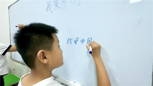 图为孩子们在黑板上写我爱中国。