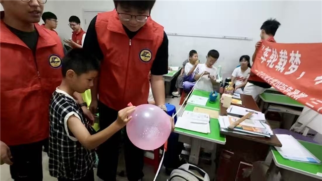 在教室里,志愿团化身“科学引路人”。他们带着孩子们组装“气球火箭”,当充气的气球在反冲力作用下“嗖”地冲向空中时,孩子们的欢呼声此起彼伏。成员们指导大家完成“牙签立水”实验,看着纤细的牙签在水面稳稳伫立,孩子们纷纷凑近观察,好奇地探究水的表面张力奥秘……趣味实验互动,不仅让科学知识从课本走进现实,更在乡村孩子心底埋下了探索未知、崇尚科学的种子。