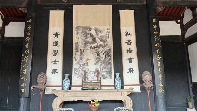 眼前的正厅陈设遵循着传统礼制:中央悬挂的《松鹤延年》图,以苍松仙鹤的意象寄托着家族福寿绵长的祈愿;两侧的对联“红杏尚书府,青莲学士家”更是点睛之笔,“红杏”对应着尚书第主人的官职身份,“青莲”则以李白的雅号彰显家族的文化底蕴,既点明了门第的显赫,又标榜了家风的儒雅。整个正厅以黑漆为底、金饰为纹,木构沉稳、陈设规整,处处体现着明代官宅“礼序井然、文气充盈”的特点,让我们在静默中感受到百年世家的风范与传承。