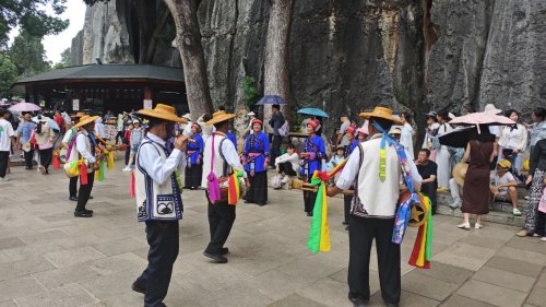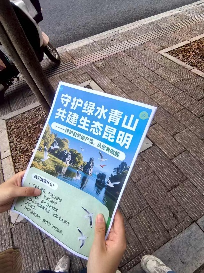暑期里,团队将宣讲中的专业知识转化为实地体验,首站深入云南石林核心区域。抬眼是剑指苍穹的柱状峰林,俯身可见岩层中清晰的古海洋痕迹,成员们在这片“天然地质课堂”里,追溯石林的形成脉络——古生代二叠纪的浅海沉积、印支与喜马拉雅造山运动的地壳抬升、雨水地下水的溶蚀切割,每一步都印证着地球演化的轨迹。而石林的价值不止于地质,彝族撒尼人“阿诗玛与阿黑哥”的传说,让冷峻的碳酸盐岩有了情感温度;糯黑村石灰岩垒砌的传统民居,藏着“顺势而为”的生存智慧。走访之余,成员们化身环保宣传员,向游客发放传单、记录“石与树”“人与景”的和谐瞬间,用行动诠释“自然遗产是自然奇观与人文智慧共同体”的理念。